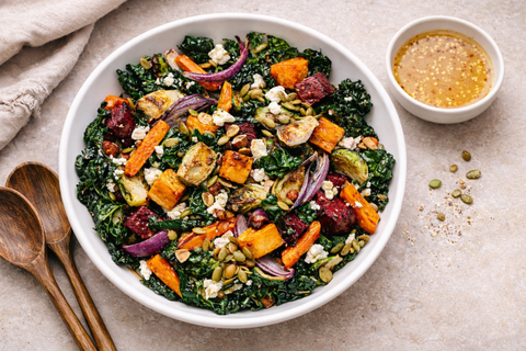 A vibrant, nutrient-packed bowl featuring roasted kale, carrots, sweet potatoes, red onion, and beets, topped with grilled Bell & Evans chicken, creamy goat cheese, and roasted pumpkin seeds. A delicious blend of flavor, texture, and nourishment — wholesome, colorful, and deeply satisfying.